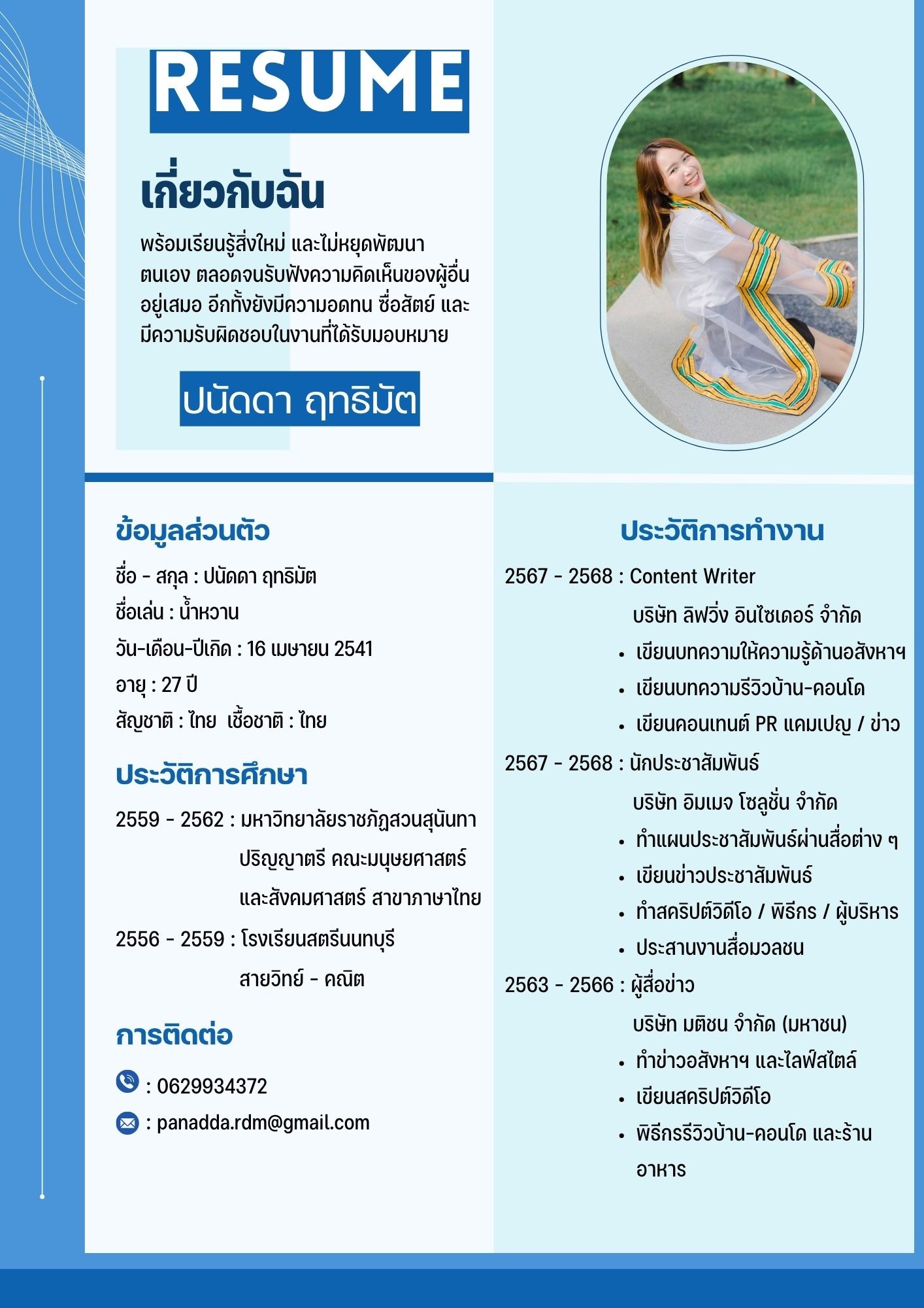 ดิฉันเป็นนักเขียนที่มีประสบการณ์มากว่า 6 ปี ในอาชีพนักข่าว, คอนเทนต์ครีเอเตอร์ และนักประชาสัมพันธ์ ซึ่งสั่งสมให้ดิฉันมีทักษะในการสร้างสรรค์บทความหรือคอนเทนต์ต่าง ๆ ให้น่าสนใจ อีกทั้งยังได้เรียนรู้กลยุทธ์และแนวทางการตลาดของหลายธุรกิจ จากการที่ได้เคยมีโอกาสสัมภาษณ์ผู้บริหารและทำข่าวตลอดเวลาที่ผ่านมา ซึ่งเชื่อว่าประสบการณ์เหล่านี้จะช่วยให้ดิฉันสร้างสรรค์คอนเทนต์ที่เข้าถึงกลุ่มเป้าหมายและบรรลุวัตถุประสงค์ขององค์กรได้เป็นอย่างดี